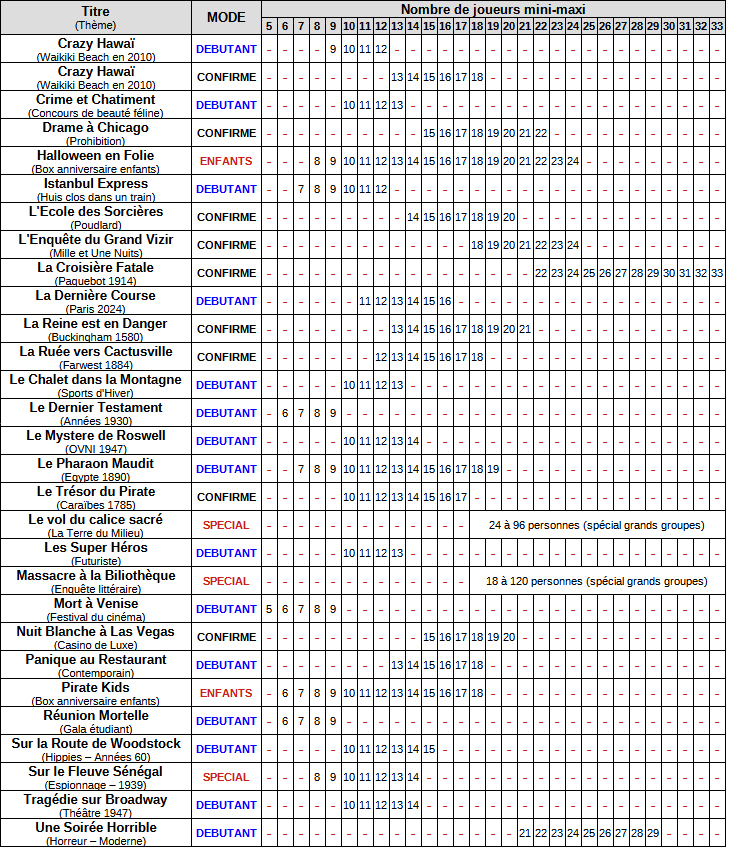 Chaque scenario (liste complète ici) aura ses propres particularités : à vous de choisir celui qui correspondra le plus à vos goûts et à la taille ou la composition de votre groupe.