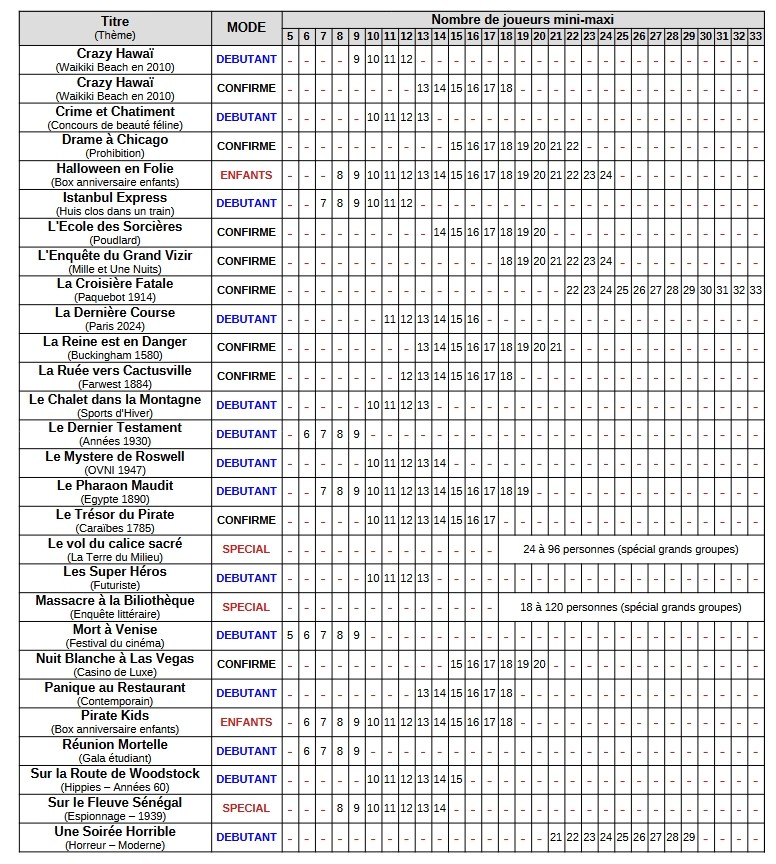 Chaque scenario (liste complète ici) aura ses propres particularités : à vous de choisir celui qui correspondra le plus à vos goûts et à la taille ou la composition de votre groupe.