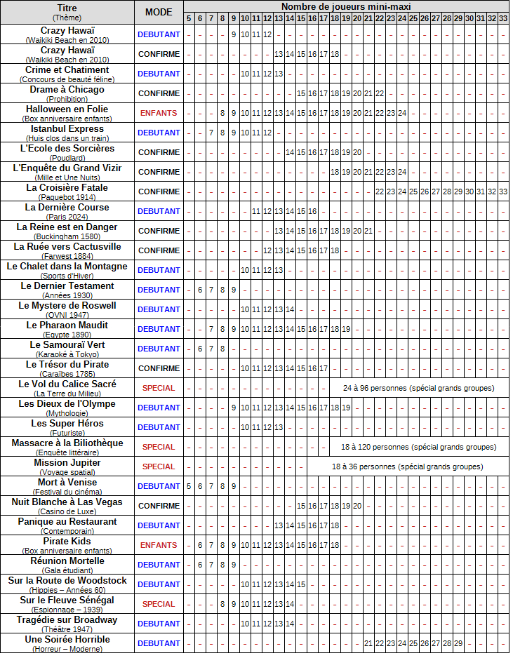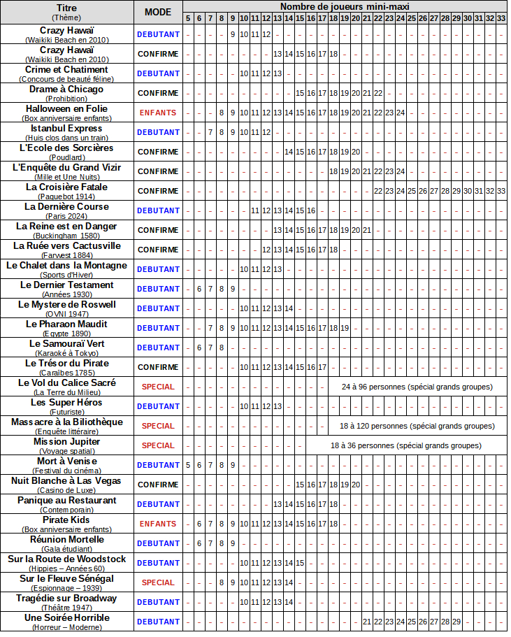 Chaque scenario (liste complète ici) aura ses propres particularités : à vous de choisir celui qui correspondra le plus à vos goûts et à la taille ou la composition de votre groupe.