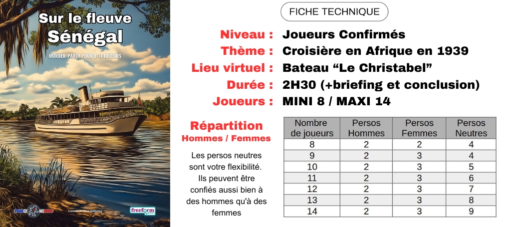 Bien qu’il n’y ait pas de meurtre initial, les joueurs auront de nombreux mystères sur lesquels enquêter. Le jeu des alliances et la course aux armes secrètes pour faire gagner son camp seront bien sûr présents mais la réussite de missions annexes sera aussi au programme de la soirée et nécessitera imagination diplomatie. Sur le Fleuve Sénégal sera clairement une aventure mouvementée !