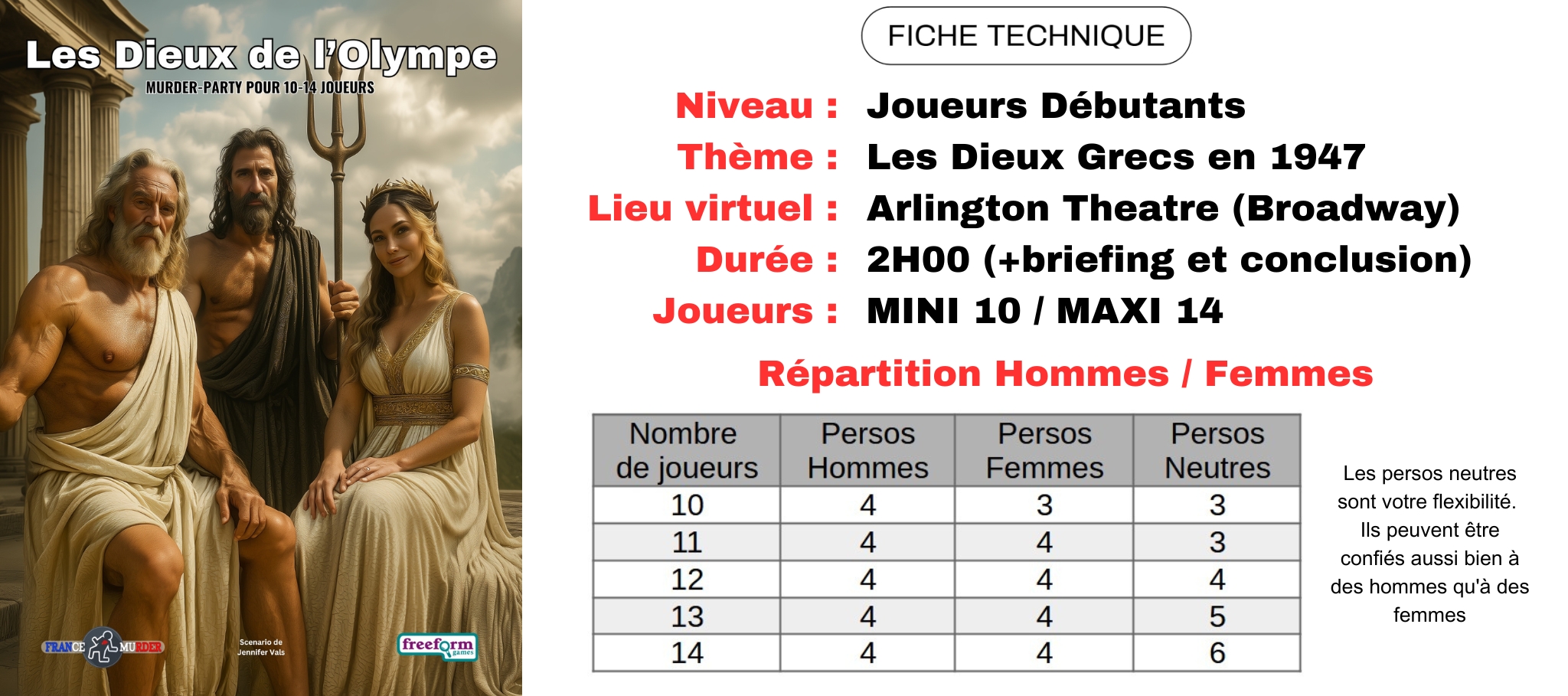 Le jeu Les dieux de l’Olympe a été conçu pour 10 à 14 joueurs. Une personne additionnelle (l’hôte) doit coordonner et organiser (héberger) le jeu. Cette personne sera aux yeux de tous un arbitre neutre et impartial. Son rôle sera de faciliter la partie en connaissant tous ses rouages. Sa mission sera donc parallèle à l’activité ludique mais elle n’en sera pas moins intéressante, tous nos joueurs le confirment.