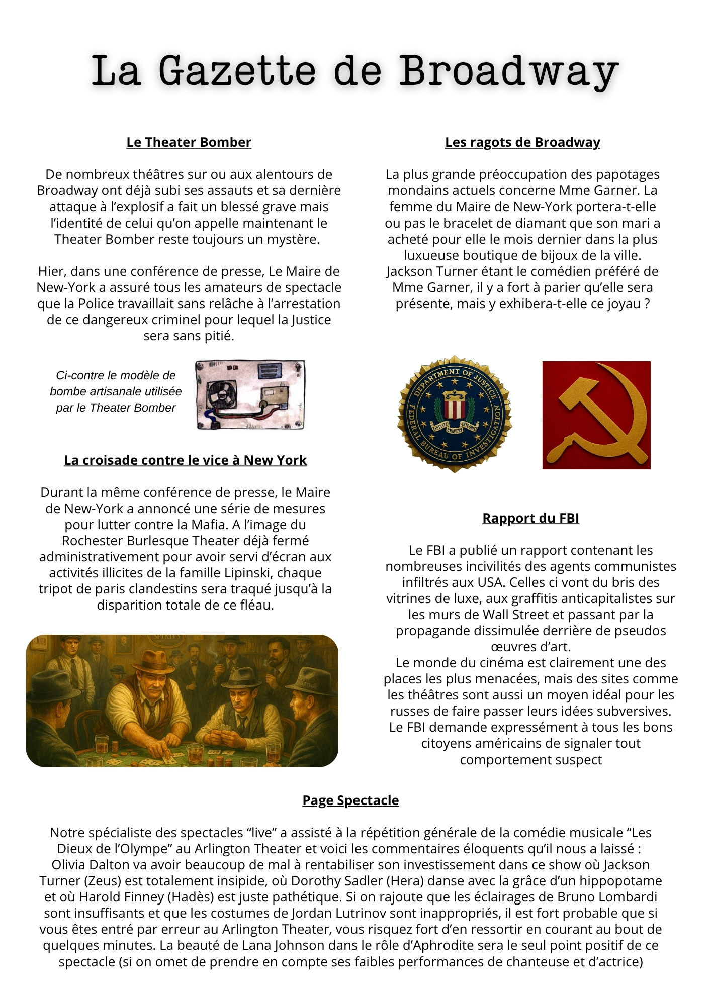 Nous sommes en 1947. Vous vous trouvez au Arlington Theater, une des nombreuses salles de spectacle de Broadway. Le « Tout New-York » s’est déplacé pour assister à la grande première de la comédie musicale « Les Dieux de l’Olympe ».